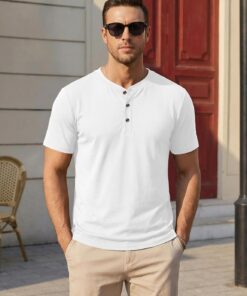 Mens Henley Shirts Short Sleeve Cotton Casual Summer Basic T-Shirts 3 Button Solid Collarless Shirts for Work