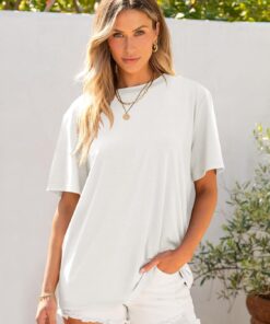 Women’s Oversized Short Sleeve T Shirts Casual Drop Shoulder Rolled Cuff Summer Tops for Work, Travel and Lounge