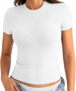 Womens Basic Short Sleeve Crew Neck T Shirt Slim Fit Tees Summer 2026 Y2k Going Out Fitted Top Cute Tight Shirts