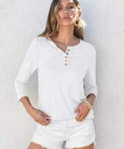 Womens 3/4 Sleeve Tops Henley Shirts Casual Trendy Button T Shirts 2026 Summer Basic Tunic