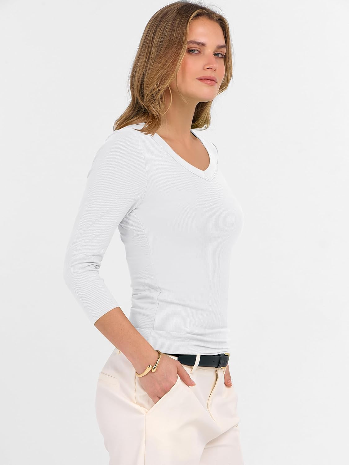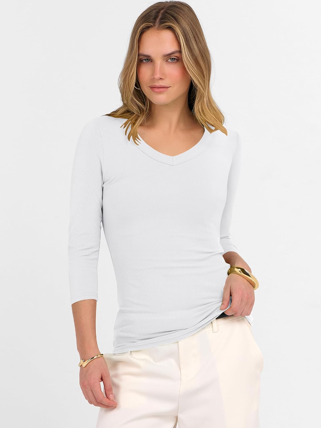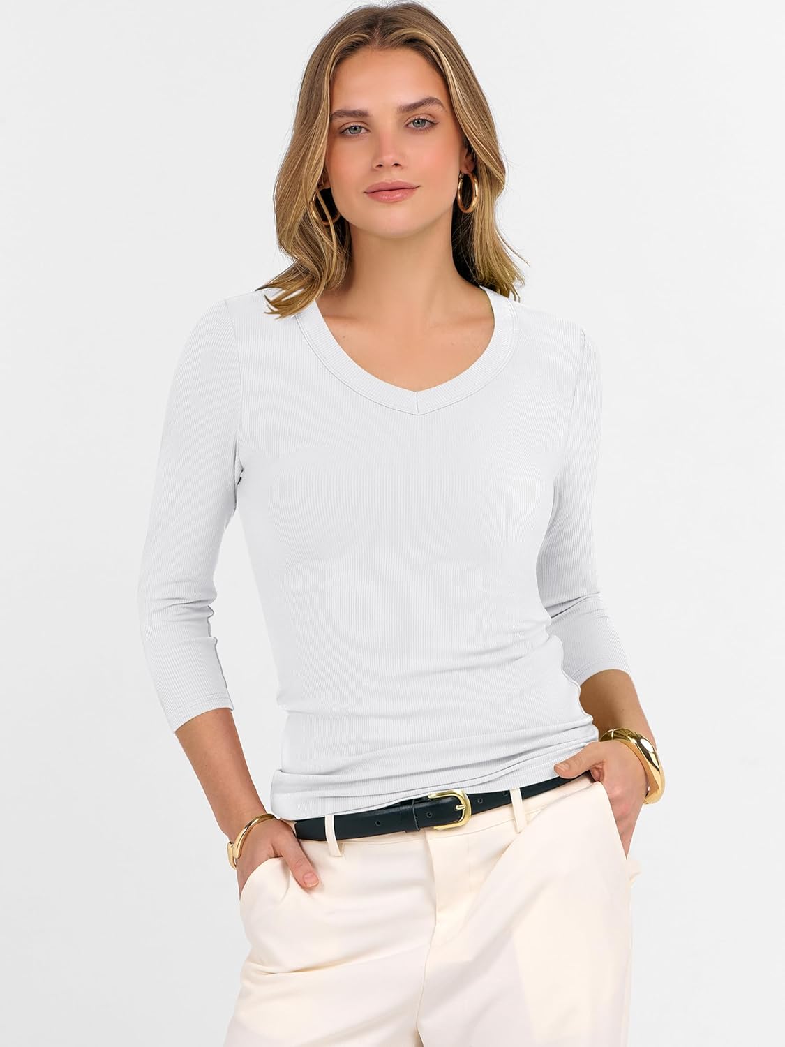 3/4 Sleeve Shirts for Women V Neck Ribbed Knit Slim Fitted Tops Basic Tshirt 2026 Summer Casual Tees Trendy Outfits