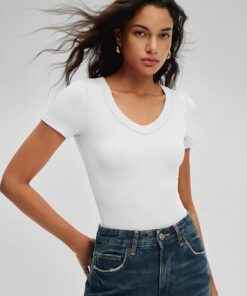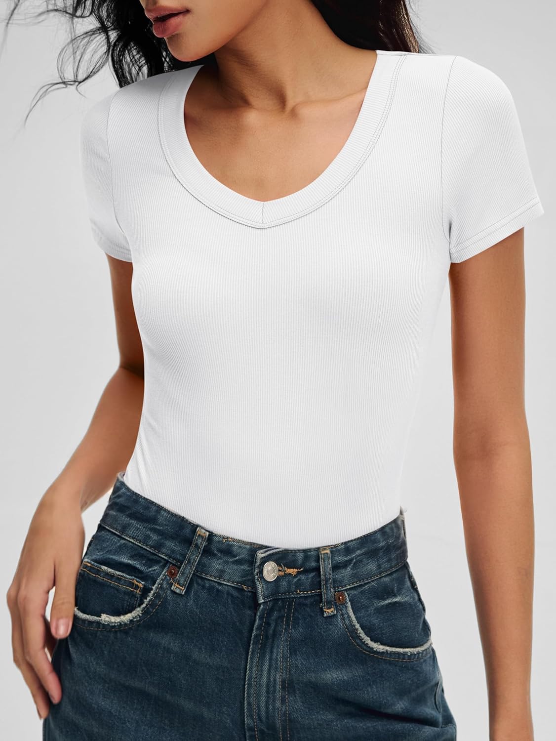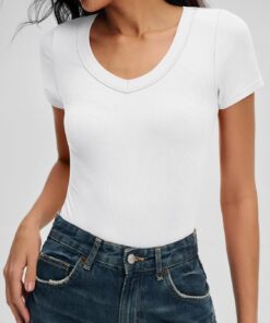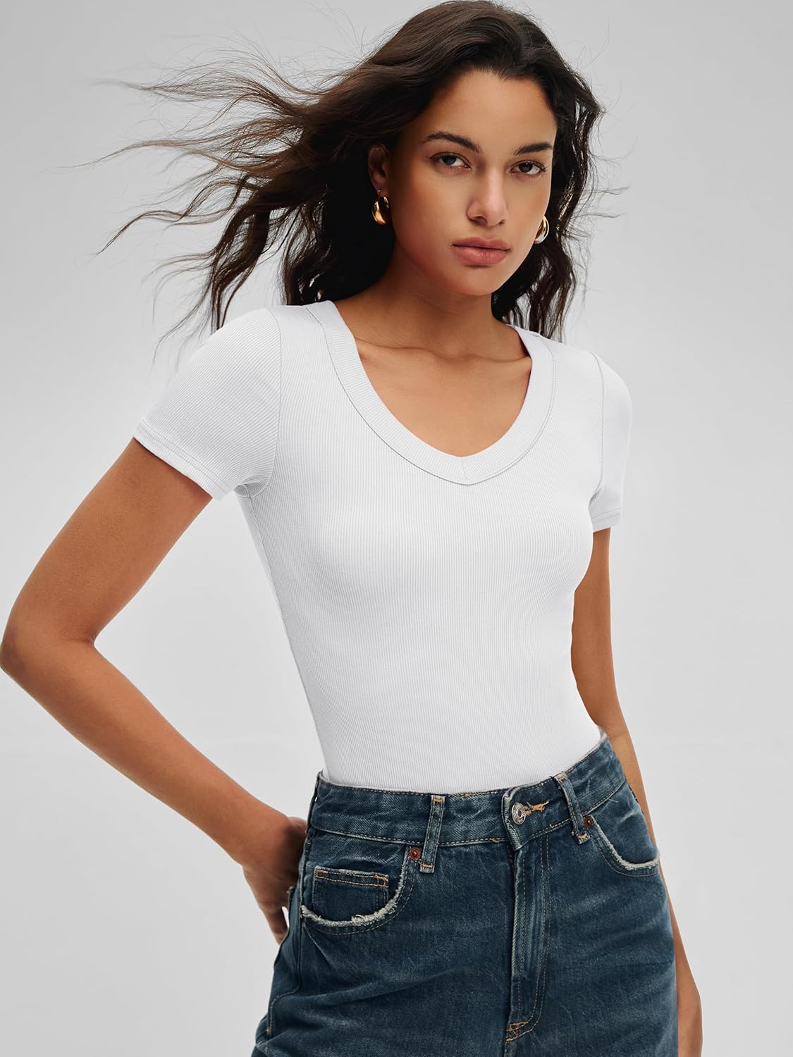 Bodysuits for Women V Neck Short Sleeve Body Suit Tops Slim Fit Ribbed Knit Soft Basic T-Shirts 2026 Summer Outfits