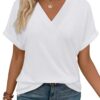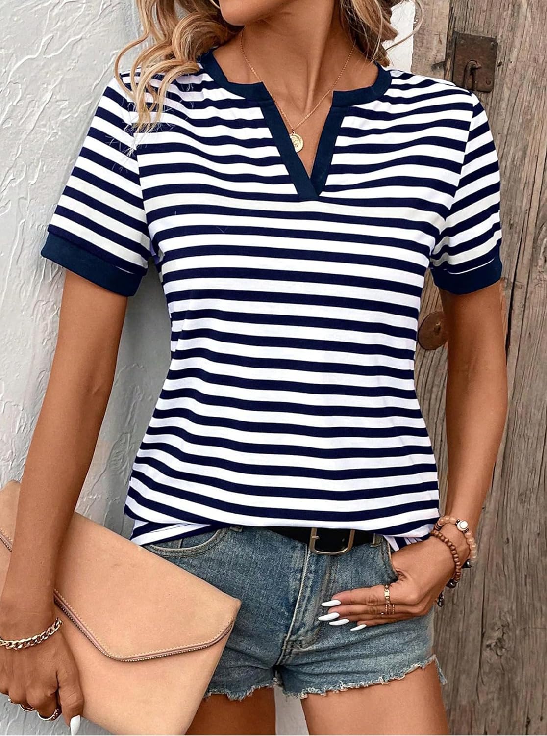 Striped Shirt Women V Neck T Shirts Short Sleeve Color Block Summer Tops