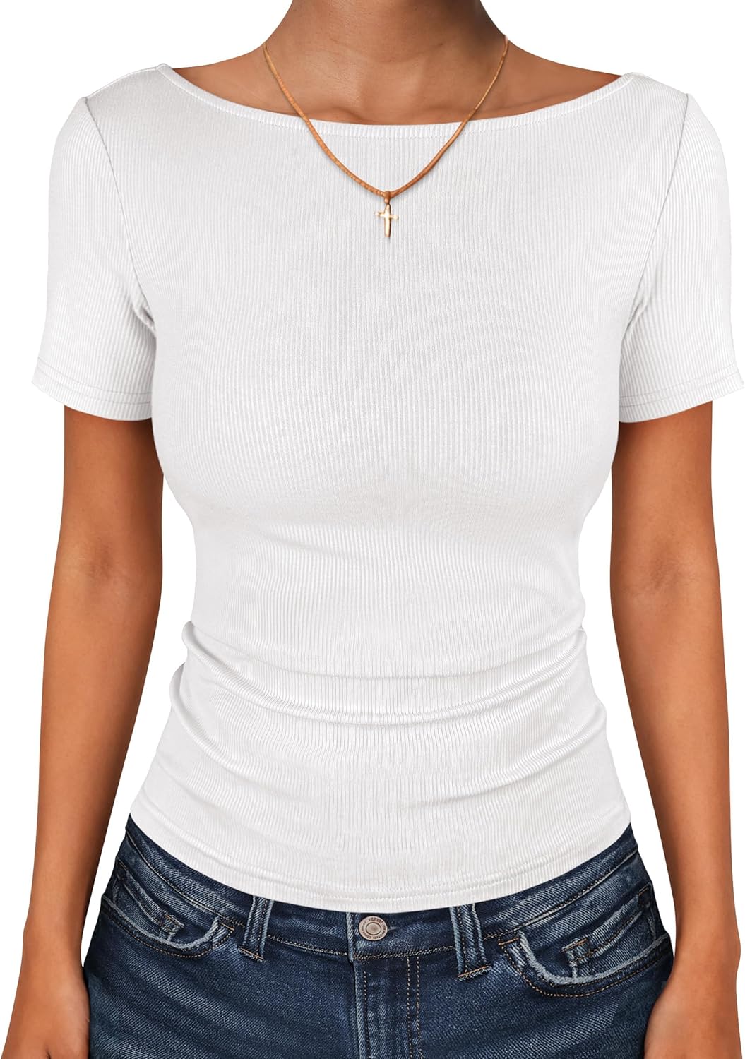 Women Boat Neck Tops Short Sleeve T-Shirts Ribbed Knit Tight Fitted Basic Tees Shirts 2026 Summer Clothes