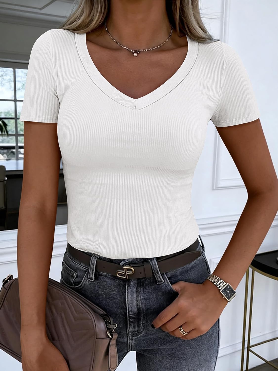 Be the first to review “Women Short Sleeve V Neck Ribbed Knit Fitted Shirts Basic Tees Tops 2026 Summer Casual T-Shirts Going Out Outfits” Cancel reply