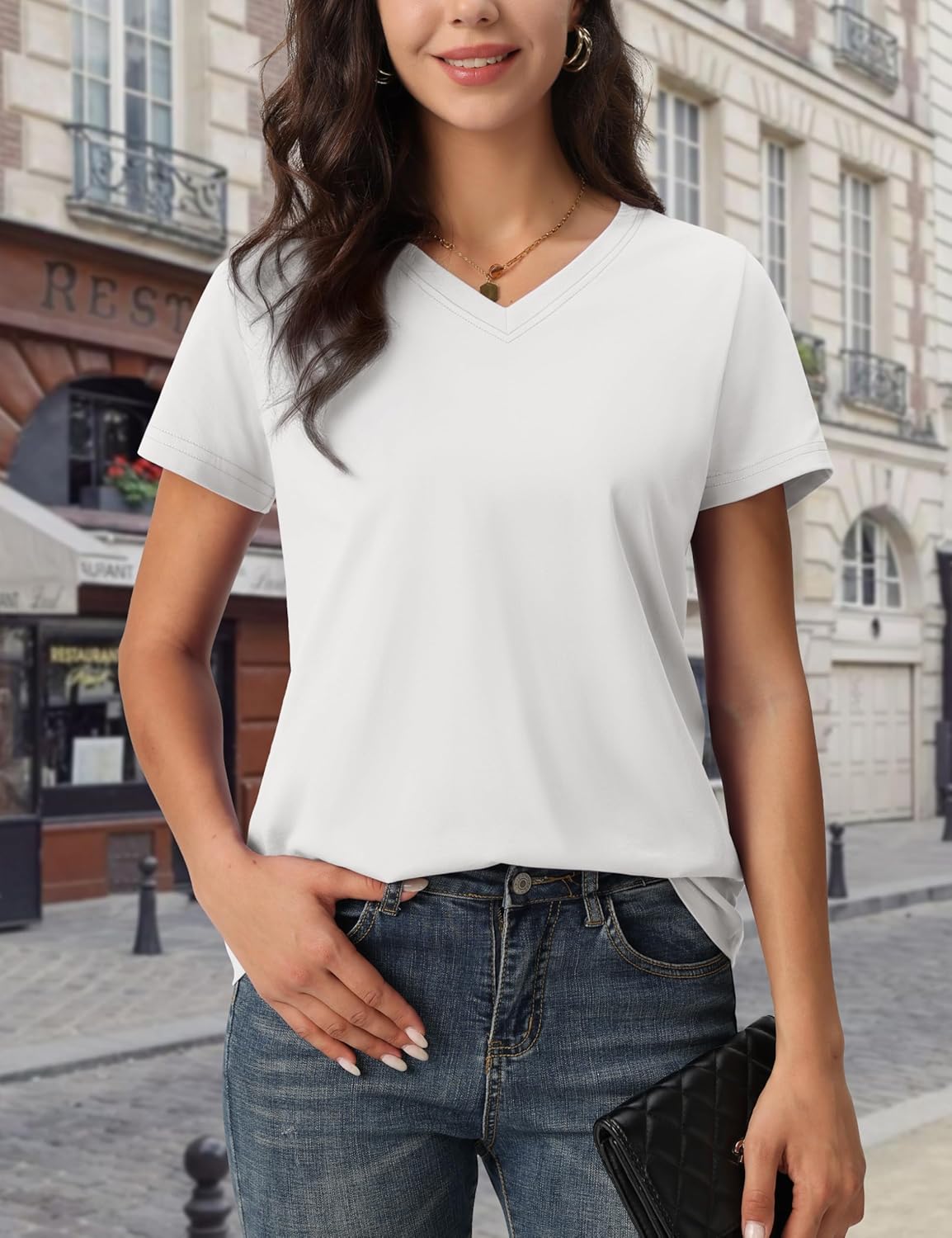 Stylish V neck goes well with jeans, skirts, etc. Tag free design ensures cozy experience. Classic fit and moderate length make it a perfect top.