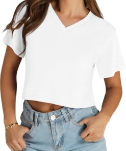 Womens Crop Tops Summer Baisc Tees V Neck T Shirts Casual Short Sleeve Cropped Top