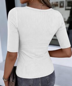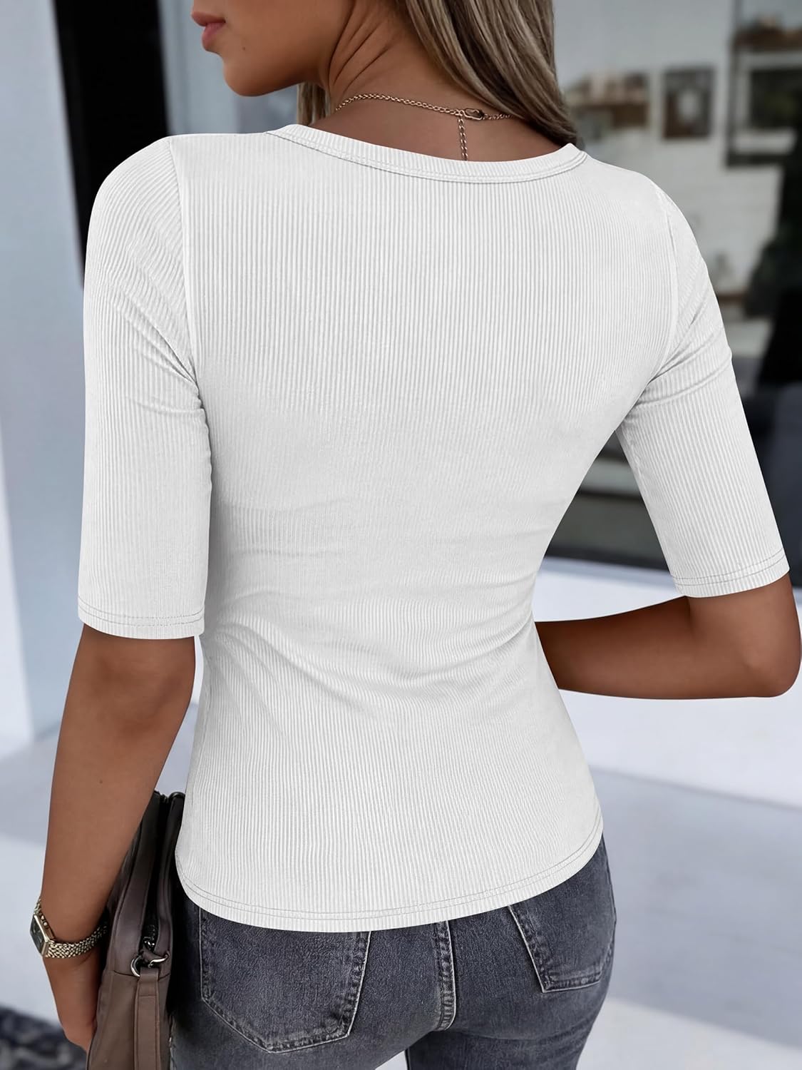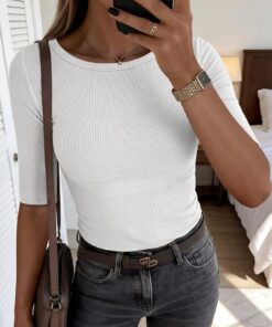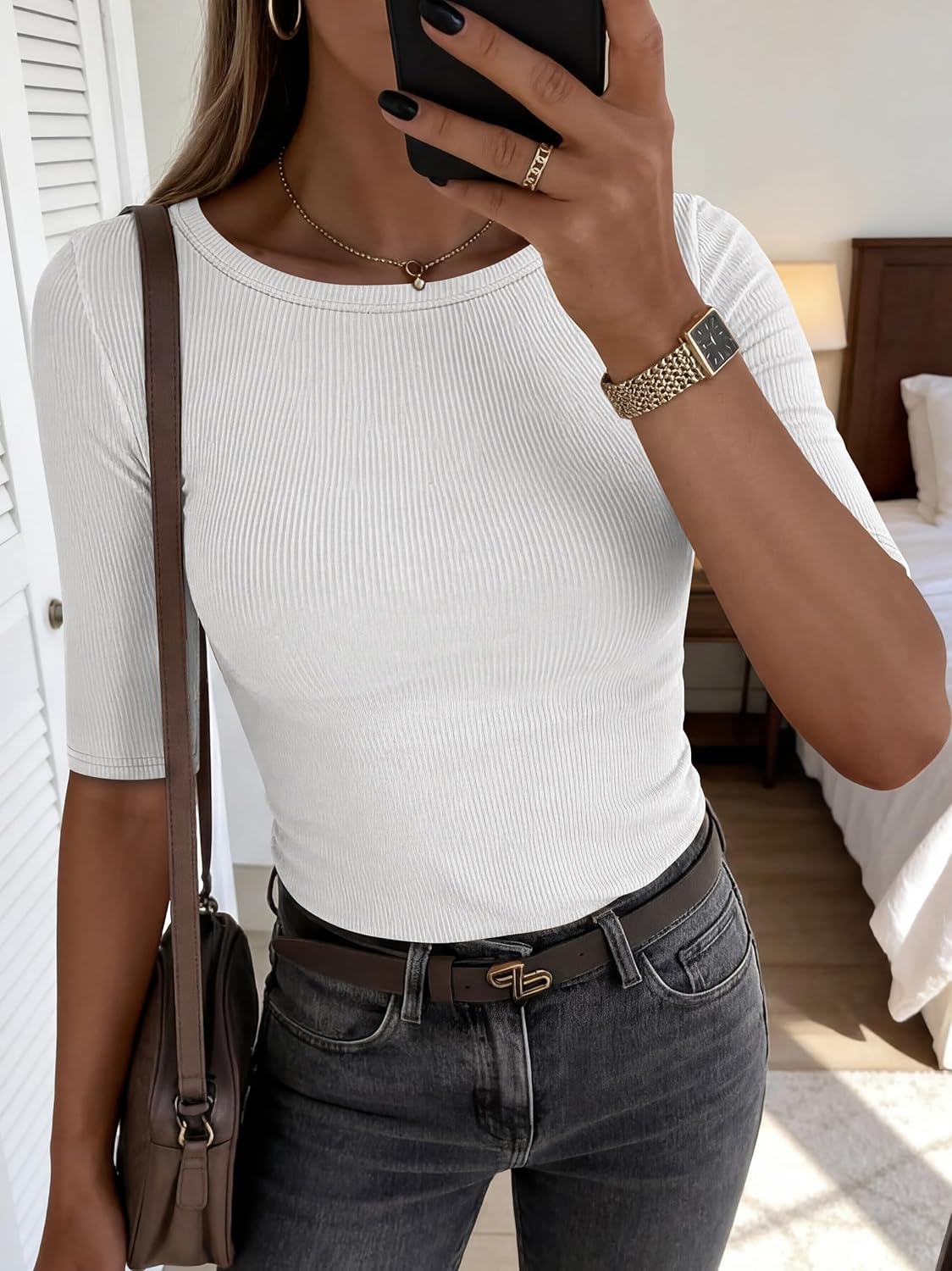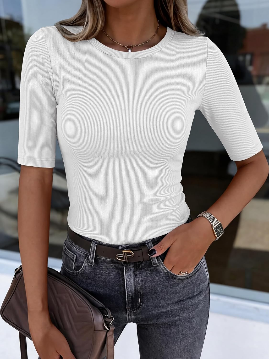 Womens Half Sleeve Crewneck Tops Ribbed Knit Slim Fit Shirts Basic Tee 2026 Spring Summer Dressy Casual T-Shirts