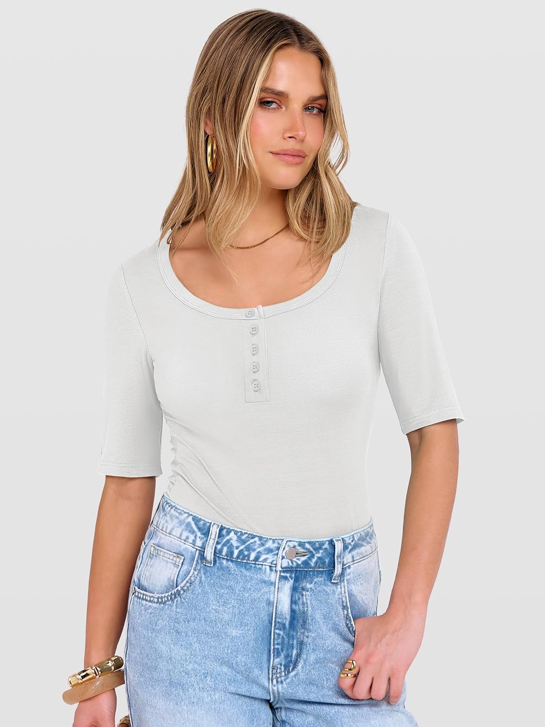 Womens Half Sleeve Tops Summer Slim Fitted Henley Shirts 2026 Spring Basic Tees Dressy Casual Blouses Cute T Shirt