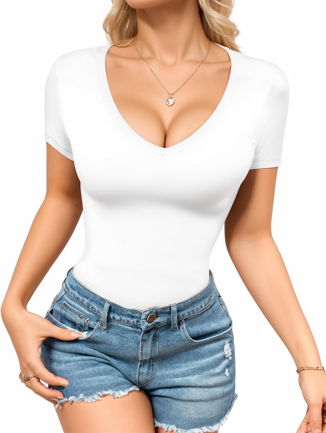 Women’s Long Sleeve Short Sleeve Bodysuit Sexy V Neck Body Suits Fitted Fall Going Out Tops