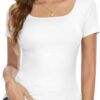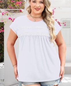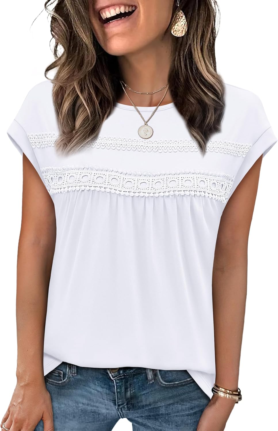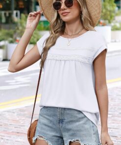 Womens Summer Tops Trendy 2026 Lace Crochet Short Sleeve Shirts Crew Neck T Shirts Casual Loose Blouses